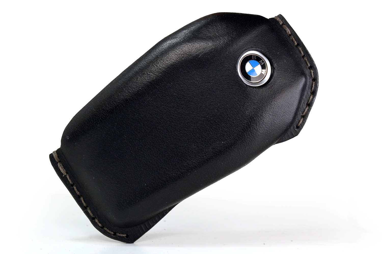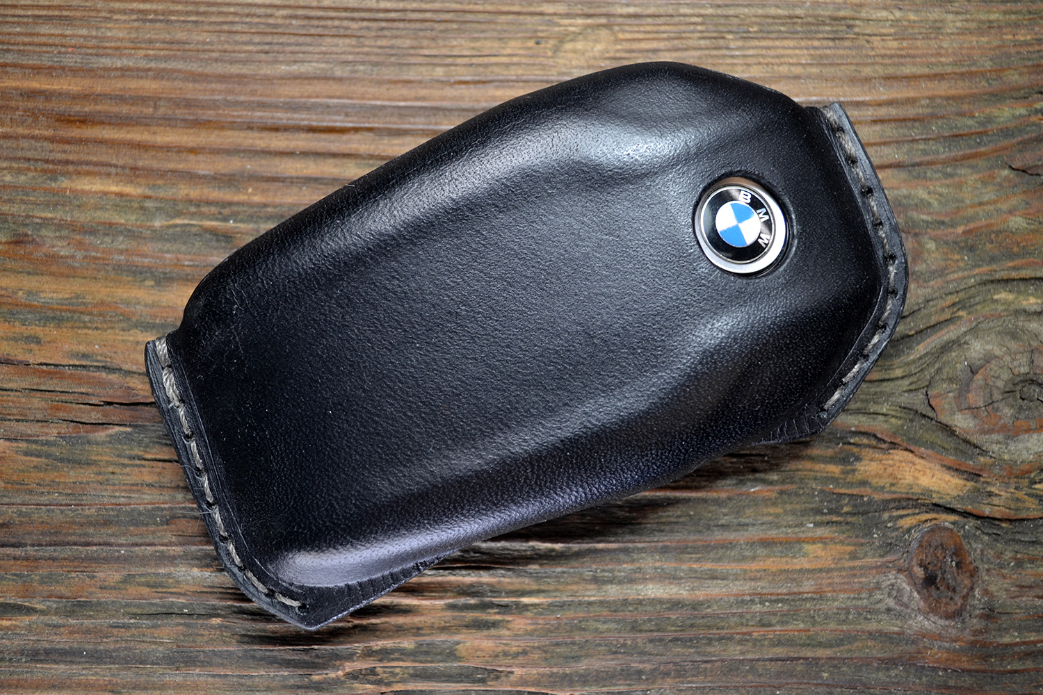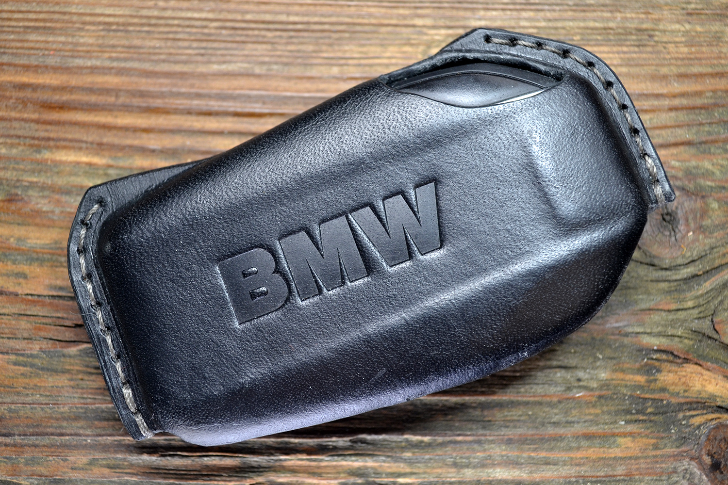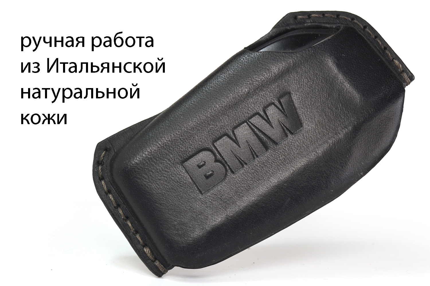 Передняя часть имеет аккуратный вырез под логотип BMW, а на задней стороне выполнено горячее тиснение BMW. Все края кожи обработаны вручную, а детали прошиты прочным вощеным шнуром, что обеспечивает долговечность и подчеркивает премиальное качество изделия. Такой чехол не только надежно защищает ключ, но и делает его стильным аксессуаром.