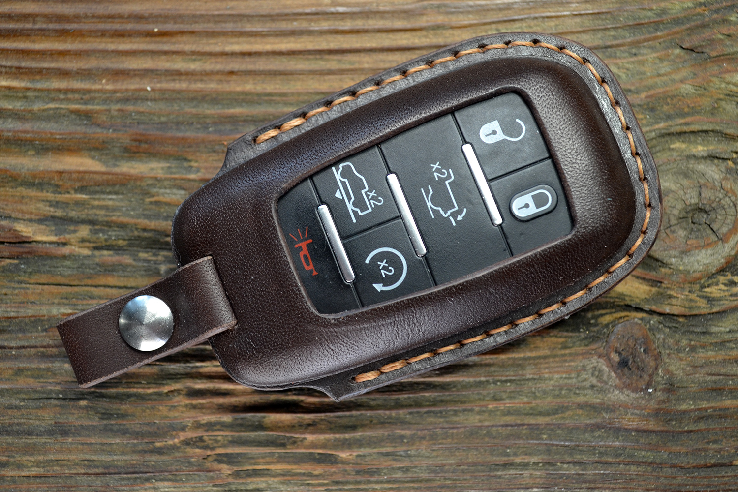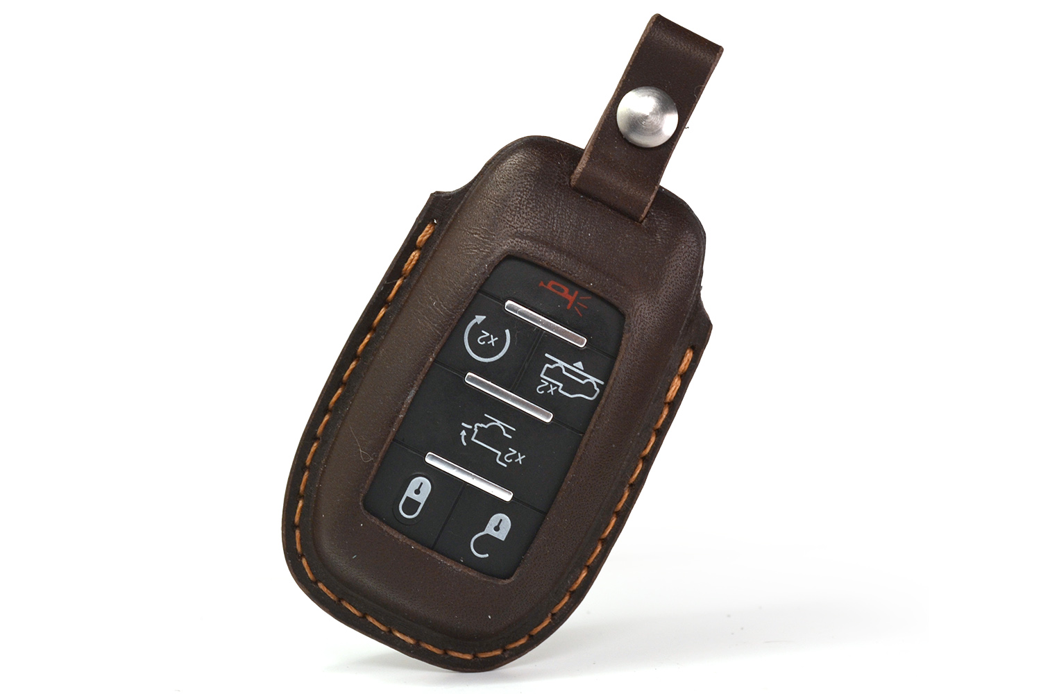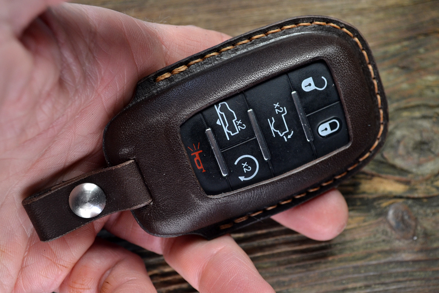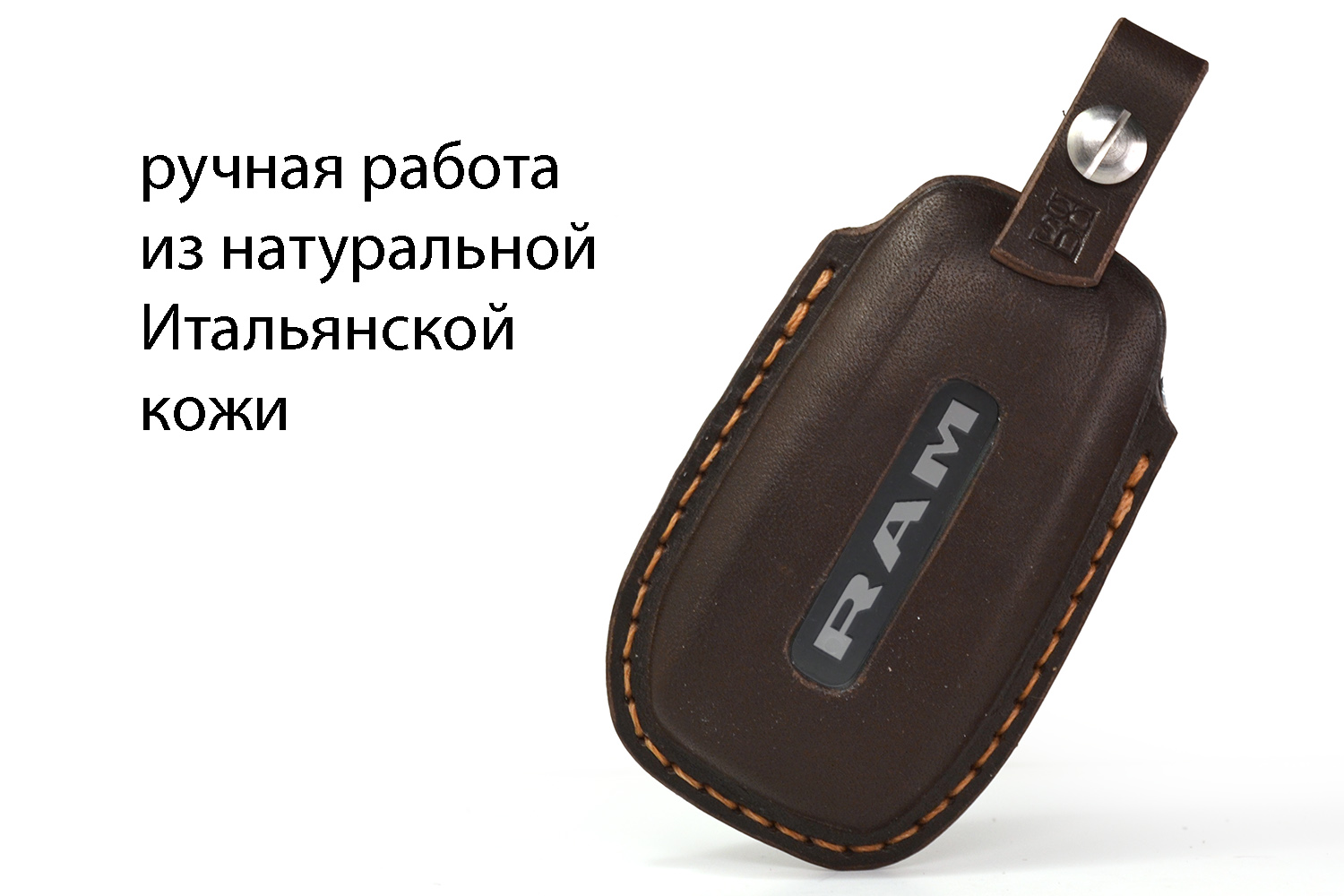 Каждый чехол прошивается вручную прочным вощёным шнуром и сконструирован в России с точной подгонкой под форму ключа Dodge RAM. Продуманный вырез под кнопки обеспечивает удобное управление, а аккуратный вырез под логотип RAM на задней части подчеркивает фирменный характер аксессуара.