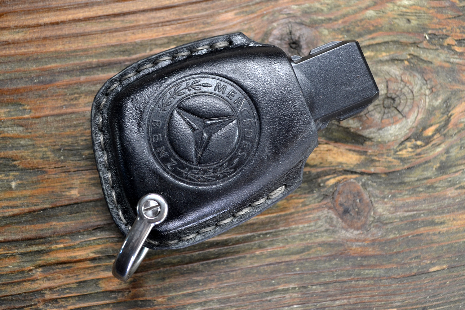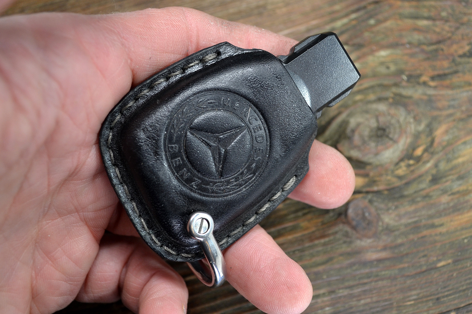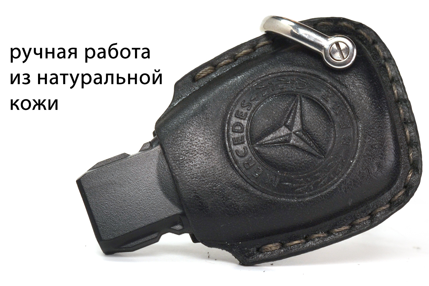 Каждый чехол прошит вручную, с вниманием к деталям и точной посадкой под ключ Mercedes. Со временем кожа красиво темнеет, приобретая уникальную патину — такой чехол стареет достойно.